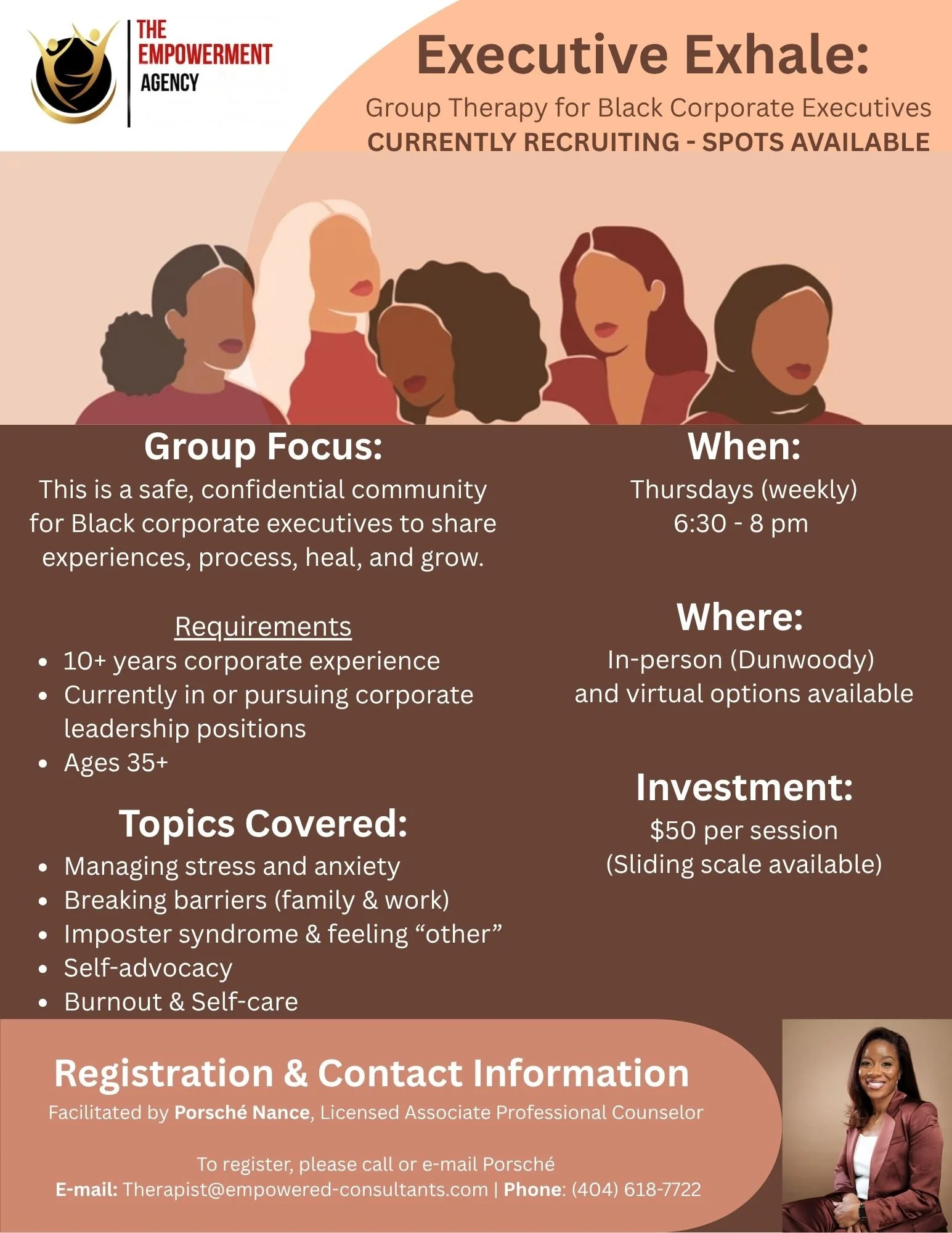 This confidential therapy group is a safe space for Black corporate executives to share experiences, process feelings, find community, and grow. Whether you’ve been the only one in the room, carried unspoken family expectations, or fought through the silence of burnout, this space is designed to honor both your resilience and your humanity.