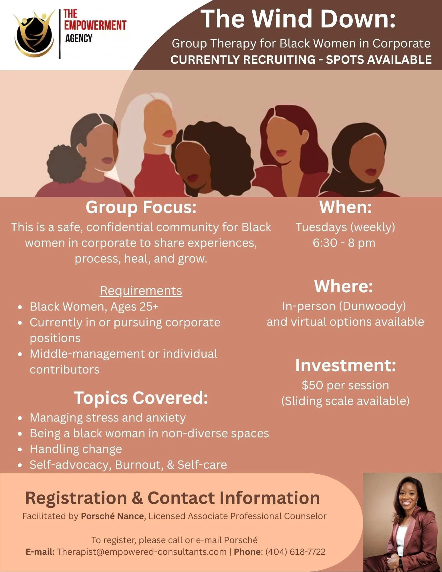 These sessions will be facilitated by Porsché Nance, Licensed Associate Professional Counselor with 15+ years of corporate experience.